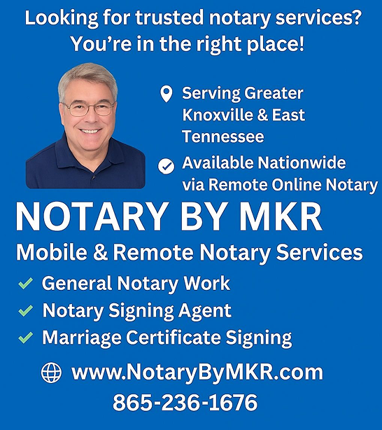 At Notary by MKR, we take pride in delivering professional, convenient, and reliable notary services tailored to your needs. Whether you require a mobile notary to come to your home, office, or care facility—or prefer the ease of a secure online appointment—we’re here to make notarization simple and stress-free. From legal documents like wills and power of attorney to real estate closings, affidavits, and passport forms, we handle it all with precision and care. We proudly serve the Greater Knoxville area in person and offer remote online services nationwide. With fast response times, flexible scheduling, and a commitment to excellent service, Notary by MKR is your trusted partner for all notarial needs.